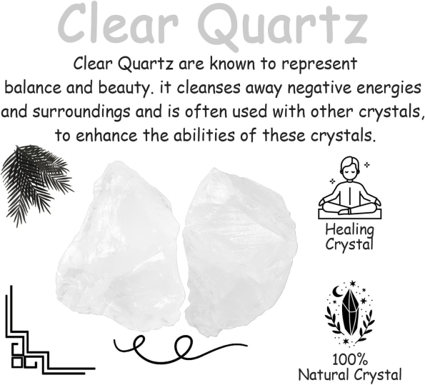 • Benefits – Clear Quartz rock are known to represent balance and beauty. Clear Quartz cleanses away negative energies and surroundings and is often used with other crystals, such as Rose Quartz and Amethyst, to enhance the abilities of these crystals. Clear Quartz corresponds to the top chakra of the human body, Clear Quartz helps in spiritual upliftment and transcendence.