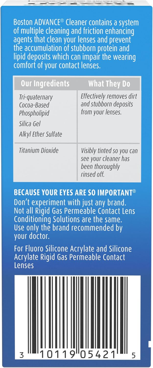 Boston ADVANCE Cleaner Contact Lens Solution, from the eye care experts at Bausch + Lomb, is step 1 in the Boston ADVANCE Formula Care System. This solution cleans your lenses and prevents the accumulation of stubborn deposits which can impair the wearing comfort of your contact lenses. To use, wash hands and rub both sides of the lenses carefully with 2 to 4 drops in the palm of your hand for 20 seconds. Then, rinse each side of the lens thoroughly with a saline solution indicated for the care of RGP contact lenses to remove the cleaner. The cleaning solution is visibly tinted so you can see your cleaner has been thoroughly rinsed off. Your lenses are now ready for step 2 – disinfection and conditioning using Boston ADVANCE Conditioning Solution (sold separately). For full instructions, see information printed inside the product carton. For fluoro silicone acrylate and silicone acrylate rigid gas permeable contact lenses. Not for use with soft (hydrophilic) contact lenses.