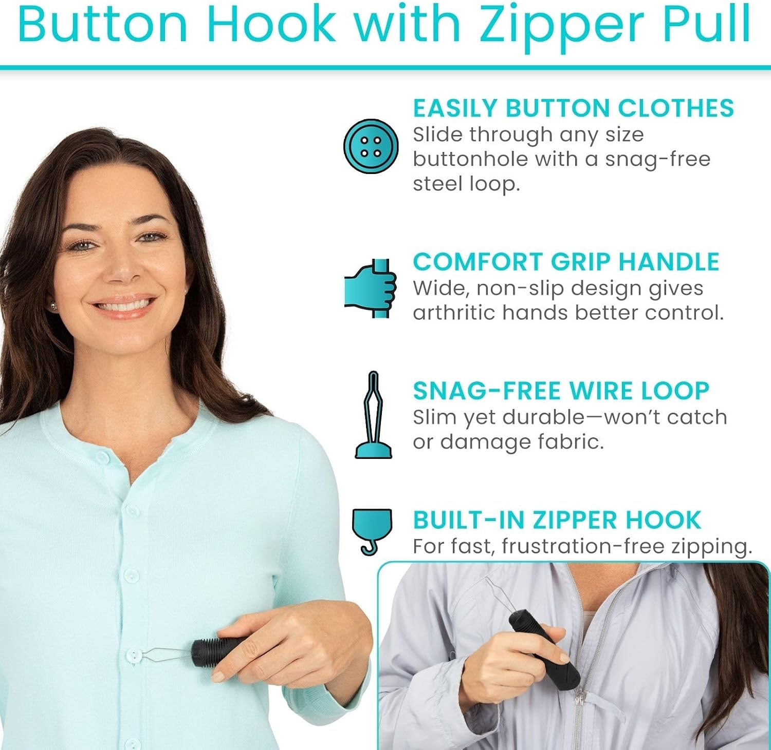 Button Hook with Zipper Pull – Dressing Helper Assist Tool for Arthritis – One Hand Shirt & Coat Buttoning Aid, Disability, Handicapped, Seniors, Elderly – Limited Dexterity, Wide Grip Handle