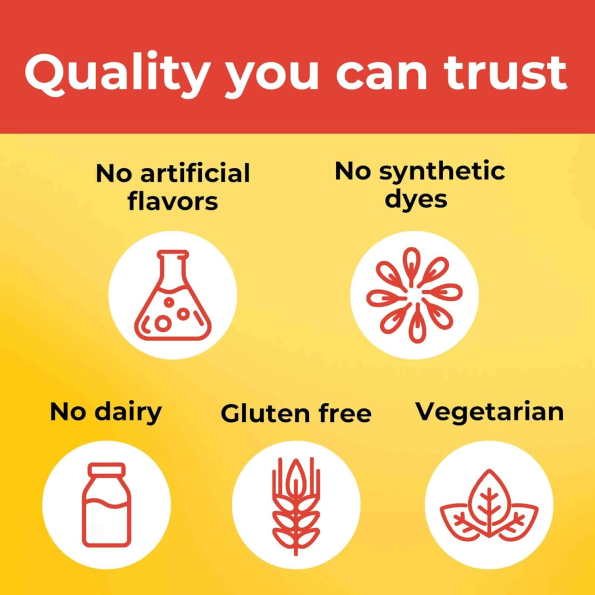 • Delicious orange citrus flavored chewable tablets that are vegetarian and gluten free with no artificial flavors, no synthetic dyes, and no dairy
