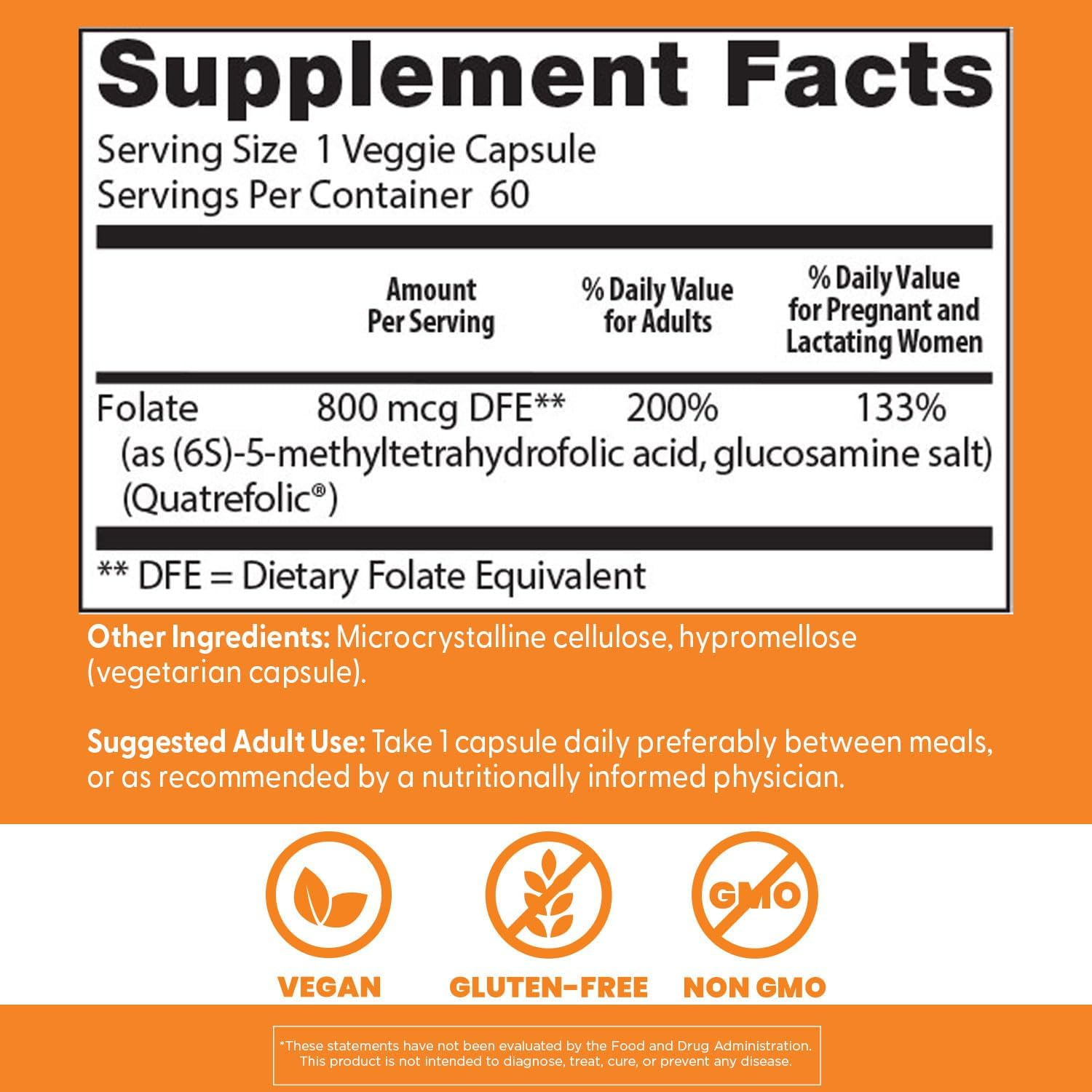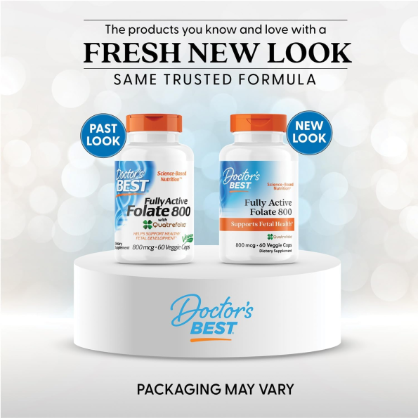 Doctors Best Fully Active Folate 800 with Quatrefolic, Supports Fetal Health, Non-Gmo, Gluten Free, Vegan 60 Veggie Caps