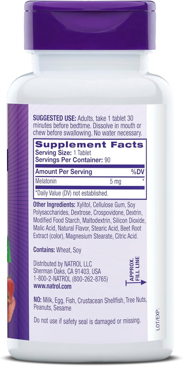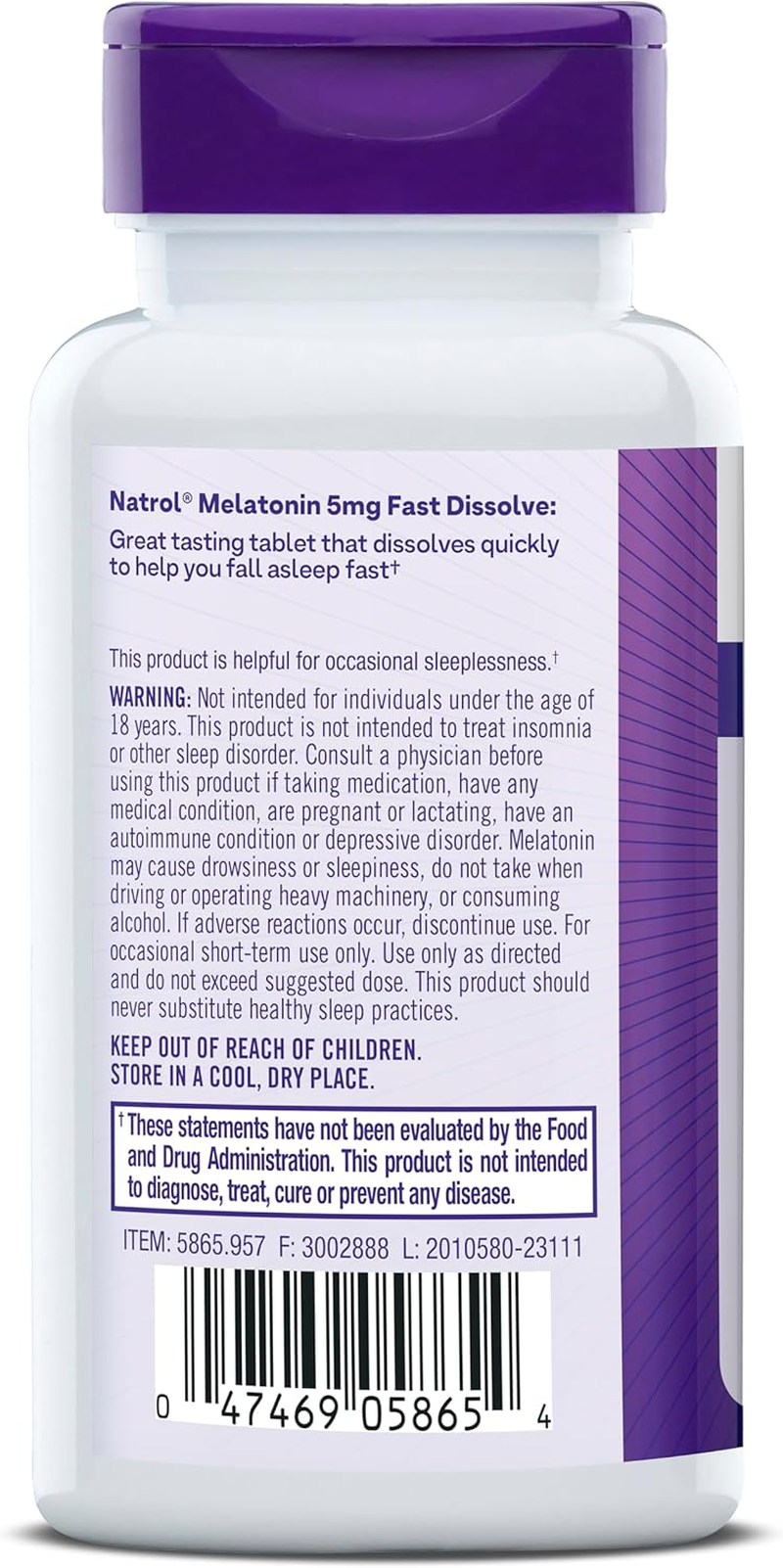 Natrol Fast Dissolve Melatonin 5 mg tablets are sleep support for adults that offer a convenient and easy-to-take option to help with occasional sleeplessness.(1) This adult melatonin nighttime sleep aid supplement is 100% drug-free, and non-habit forming. Natrol melatonin supplements for sleeping offer 5 mg of melatonin per serving, providing the sleep support you need to fall asleep faster and stay asleep longer.(1) Natrol Melatonin fast dissolve tablets promote sleep in as little as 15 minutes.(1) Natrol’s fast dissolving, vegetarian sleep supplements formula with great-tasting strawberry flavor make these sleep aid tablets convenient to take before bed. Suggested Use: Adults, take one melatonin 5 mg fast dissolve tablet 30 minutes before bedtime. Dissolve in mouth or chew before swallowing. No water necessary. Natrol is dedicated to creating innovative, quality products, to help you maintain good health and thrive in your busy, modern lifestyle. (1)These statements have not been evaluated by the Food and drug administration. This product is not intended to diagnose, treat, cure or prevent any disease. (2)Nielsen, xAOC, 52 weeks ending 10/26/24, Sleep Aid Supplements