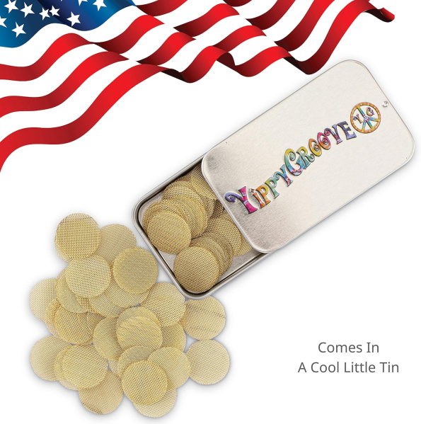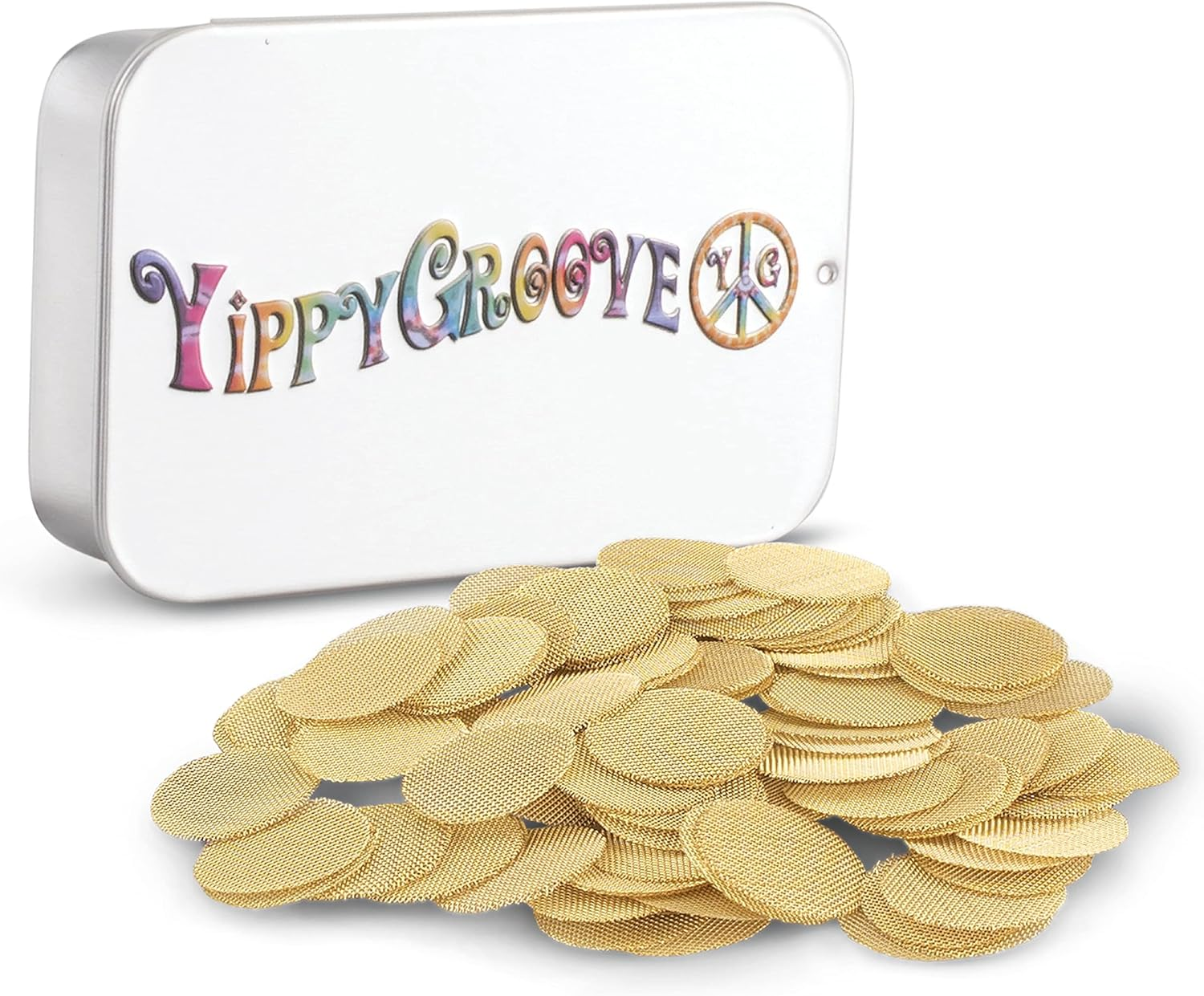 The EXCEPTIONAL QUALITY of these 3/4” (1.9cm) Brass Pipe Screens will be immediately obvious if you’ve been buying screens from the local convenience store or pipe shop. Made 100% in the U.S.A., these metal brass screens will last many times longer than most other screens you can buy. They are easy to clean, yet inexpensive enough to just toss. Plus, they come in a super cool Limited Edition YippyGroove StashTin, for whatever little treasures you want to keep in it! Thank you for your order!