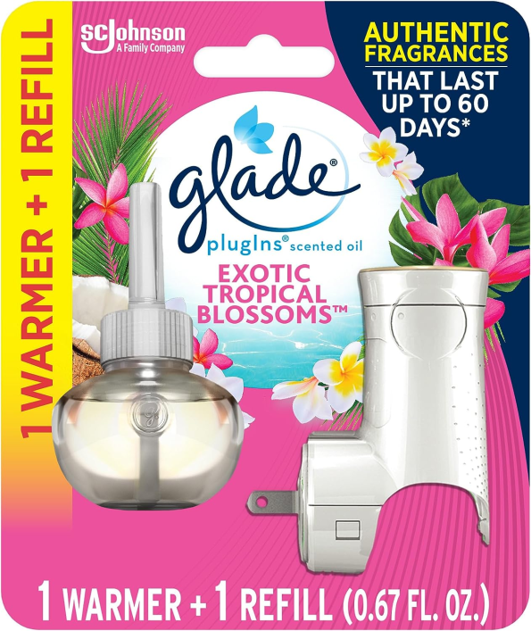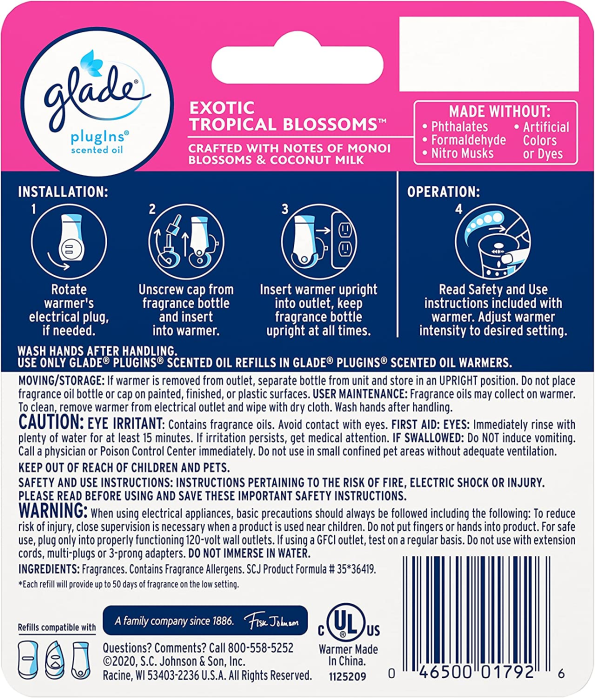Bring on tropical bliss with our Glade Exotic Tropical Blossoms PlugIns air freshener for home. Consciously crafted by master perfumers with notes of monoi blossoms, melon and coconut milk. Take an exotic vacation from the comfort of your couch with our scent diffuser and change the mood with 2x more adjustability (vs. previous Glade warmer). Express your mood with electric oil diffuser in Exotic Tropical Blossoms fragrance. Simply remove the cap from the refill and insert it into the Glade plug in warmer. Plug the warmer into an outlet and adjust the level of fragrance to create the mood you want. Get enchanted and energized with Glade’s PlugIn air freshener and fragrance infused with essential oils.