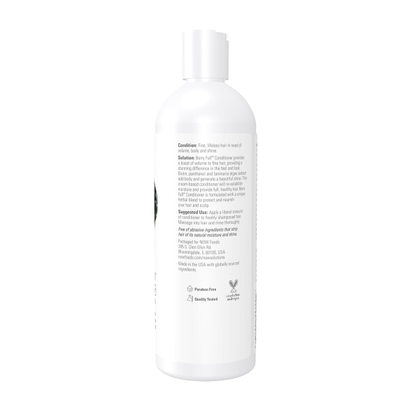 Condition: Fine, lifeless hair in need of volume, body and shine. Solution: Berry Full™ Conditioner provides a boost of volume to fine hair, providing a stunning difference in the feel and look. Biotin, panthenol, and algae extract add dramatic body and generate a beautiful shine. This cream based conditioner will re-establish moisture and provide full, healthy hair. Berry Full™ Conditioner is formulated with a unique herbal blend to protect and naturally nourish your hair and scalp. Free of abrasive ingredients that strip hair of its natural moisture and shine. NOW® Solutions products are not tested on animals.