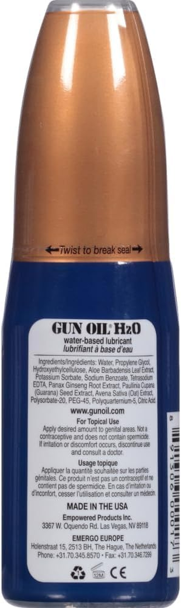 Gun Oil H2O Lubricant 2 ounces. High-tech lube for smooth, rapid-fire action. Gun Oil H2O water-based lubricant is formulated to the same high quality specifications as Gun Oil silicone lube. This condom-safe lube is highly concentrated yet easy to wash off. Gun Oil H2O is Glycerin free, hypoallergenic and contains no pigment, so it does not stain fabrics. Fortified with Aloe Vera for healing and restorative properties. Gun Oil H2O is gentle on your skin. Water based lube stays slicker longer! Gun Oil H2O water-based lubricant is formulated to the same high quality specifications as Gun Oil Silicone lube. This water-based formula is highly concentrated to stay slick longer, yet easy to wash off. Fortified with Aloe Vera, Gun Oil H2O provides extra moisture and is gentle on your skin. Gun Oil H20 provides extra moisture and is gentle on your skin. Gun Oil H20 is Glycerin-free for added health benefits and is also flavor-free, scent-free and pigment-free for guaranteed satisfaction. Ingredients: Water, Propylene Glycol, Hydroxyethylcellulose, Aloe Barbadensis, Leaf Extract, Methylparaben, Sodium Benzoate, Tetrasodium EDTA, Ginseng Root Extract, Paullinia, Cupana Seed Extract, Avena Sativa Extract, Polysorbate-20, PEG-45M, Polyquaternium-5, Aspartame. Water based latex condom compatible. Empowered Products. Plastic bottle. Please note the package is changing on this item.